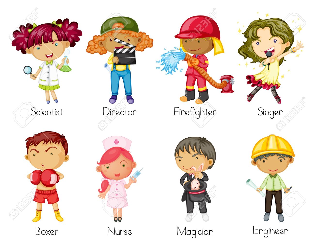 Selecciona diez trabajos y estructura una oración (utilizando el trabajo elegido, dibuja) como el siguiente ejemplo:My mother is a nurse, she likes help people.